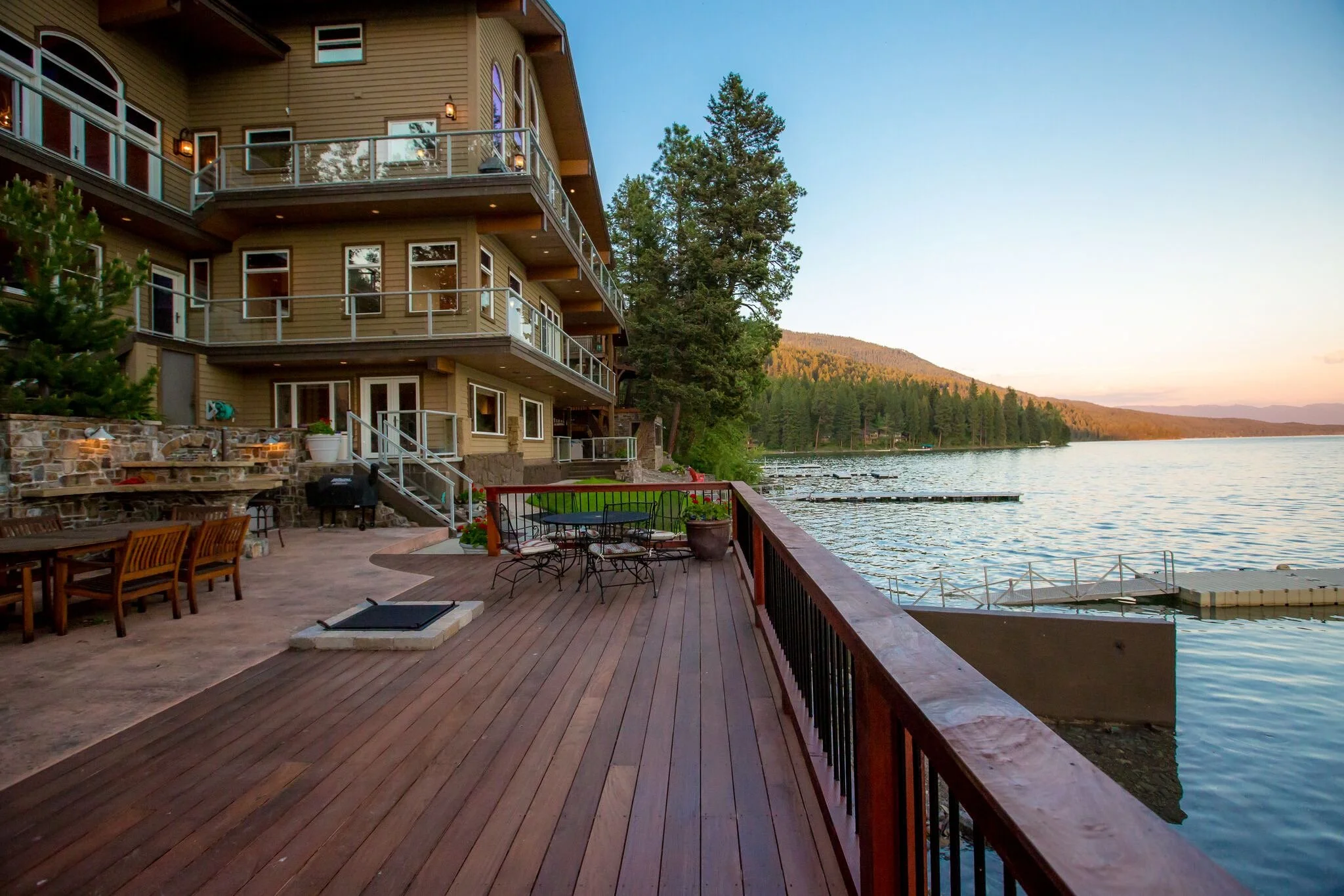 2,500 sq. ft. of decks on the shores of Whitefish Lake with a 40’ boat dock that can dock two ski or pontoon boats and two personal water craft. The Lodge is 6,500 sq. ft. and is directly adjacent to public lands that stretch 50 miles to the Canadian border. Fine dining is 15 minutes by boat at The Lodge at Whitefish Lake.